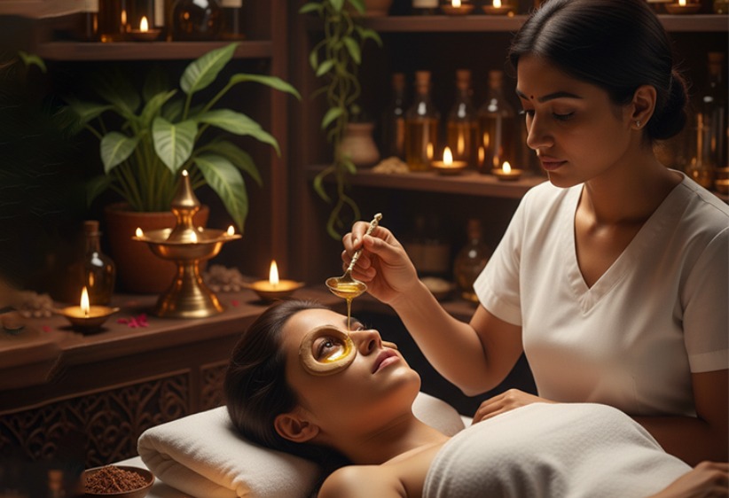 You will lie down comfortably as a small dam of dough is created around your eyes. A continuous stream of medicated liquid, such as herbal decoction is then gently poured into this dam, completely covering your eyes. The therapy helps to cleanse and cool the eyes, providing deep relaxation.