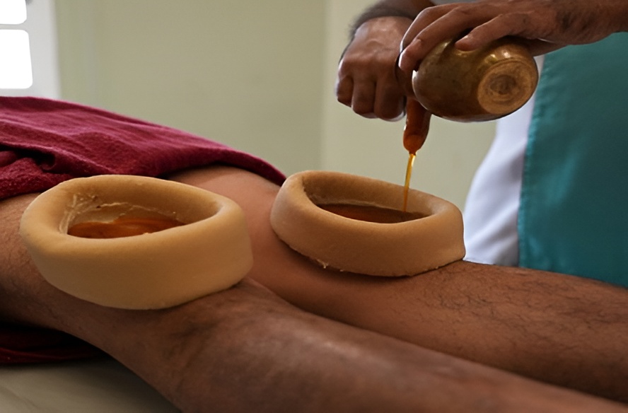 You'll lie down comfortably as the Therapist places a ring of herbal dough around the affected knee joint. Warm, medicated oil is then gently poured into this ring and allowed to rest. The deep, sustained heat of the oil works directly on the knee joint.